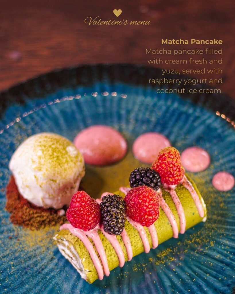 Matcha pancake filled with fresh cheese and yuzu, served with raspberry yogurt and coconut ice cream